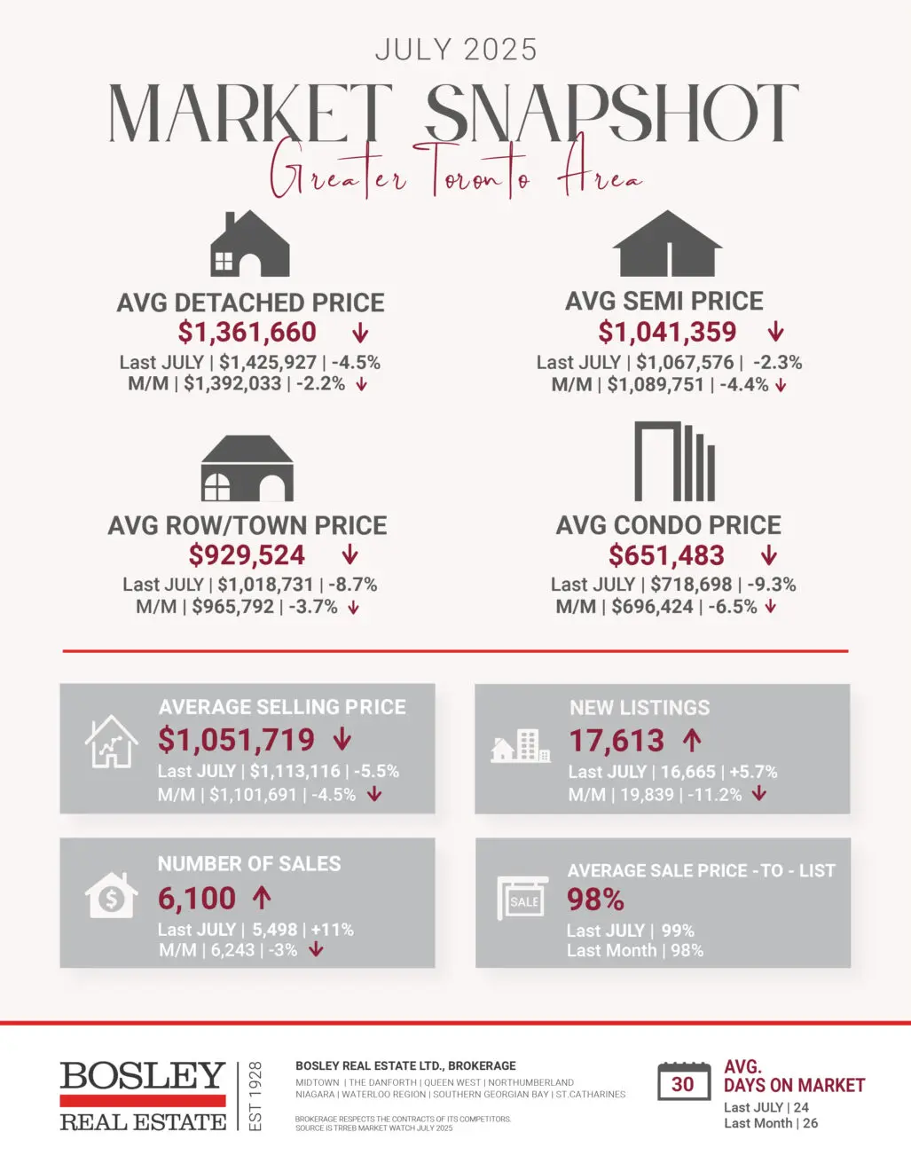 The average selling price in the GTA fell 5.5%, from $1,113,116 in July 2024 to $1,051,719 last month.