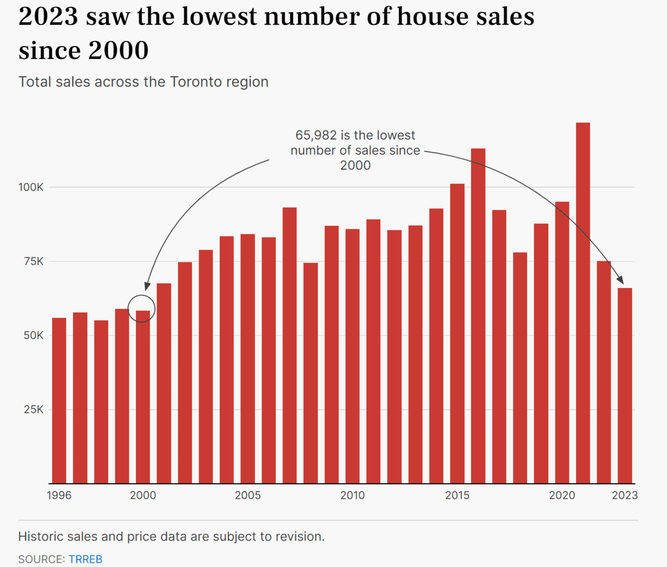There were 65,982 total home sales reported through TRREB’s MLS® System in 2023, a 12.1 per cent dip compared to 2022, the lowest sales recorded since 2000, when Toronto’s population was two-thirds its current size and the average price of a home was $243,000. Even during the 2008 financial crisis, home sales hit 74,500. By comparison, home sales reached a record 121,700 during the 2021 pandemic real estate frenzy when buyers jumped into the market taking advantage of historically low-interest rates.