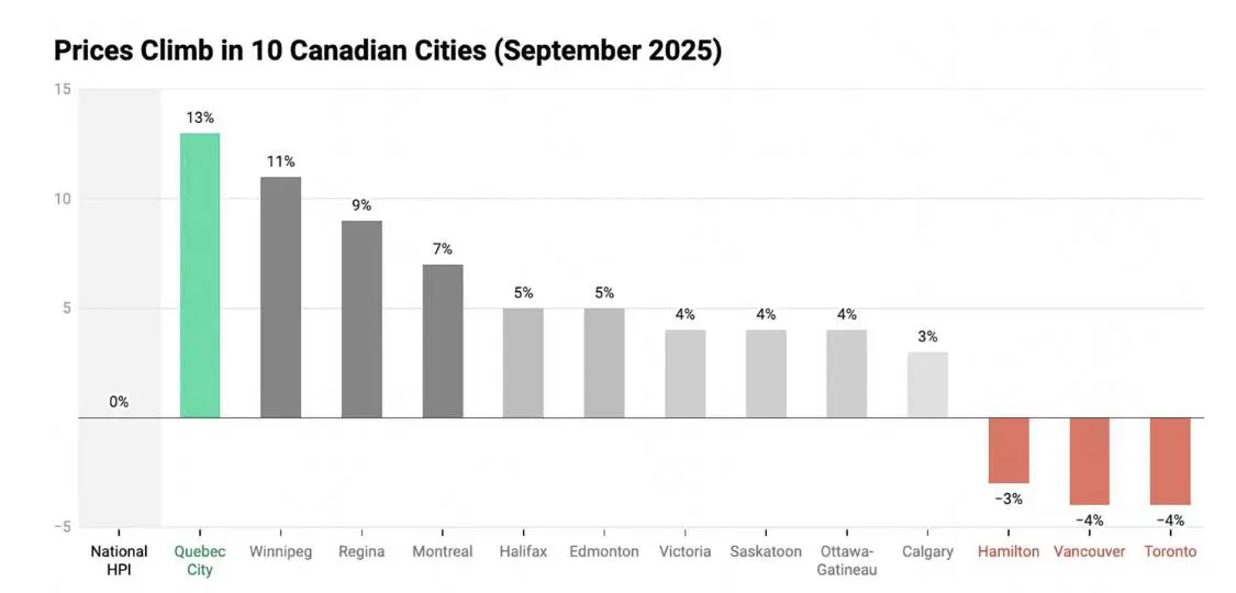 In contrast, once-affordable Quebec City has seen prices climb 13 per cent over the past year, while Winnipeg (+11 per cent), Regina (+9 per cent), and Montreal (+7 per cent) have also posted notable gains, driven in part by population growth and migration.